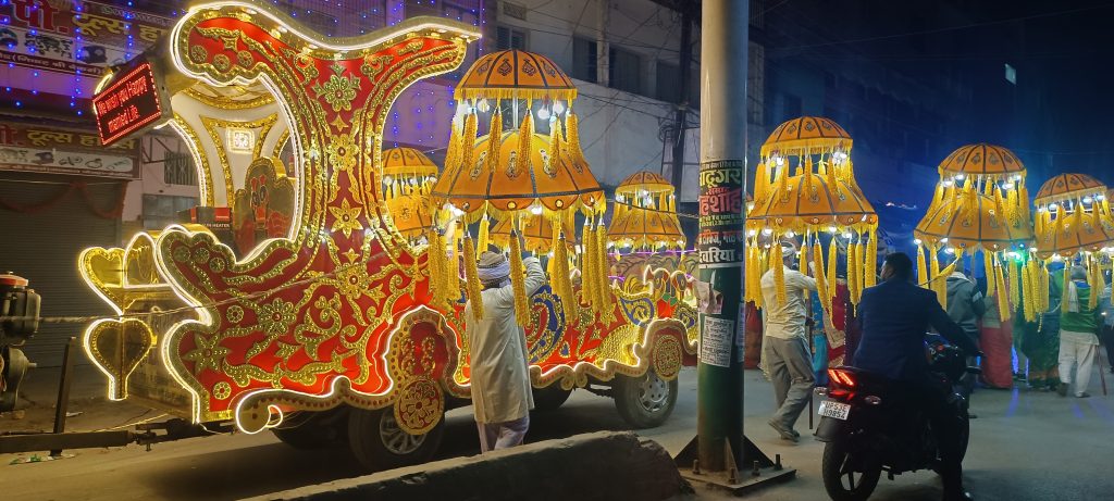 A chariot adorned with roadlights illuminates the path of love and celebration, guiding the couple towards a bright and joyous future together.