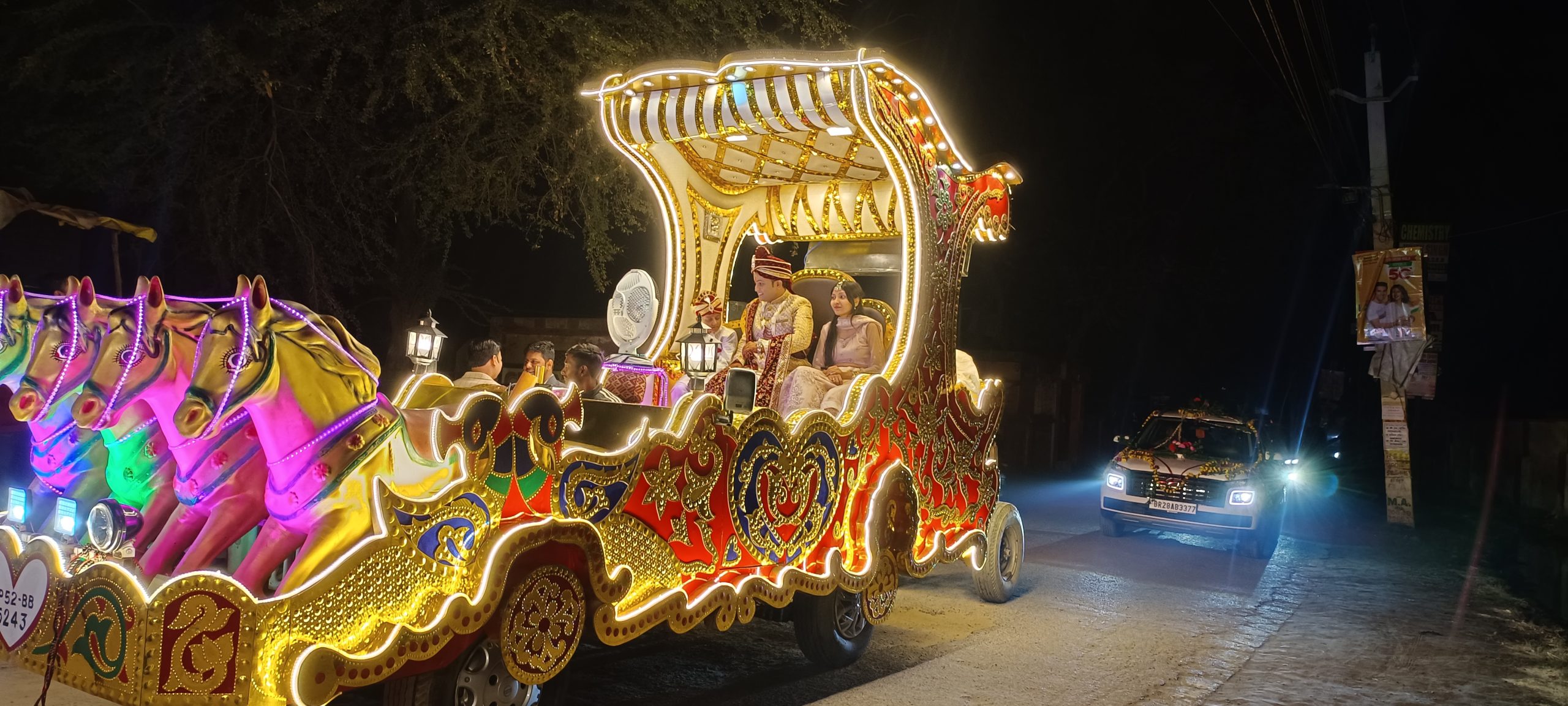 A chariot adorned with roadlights illuminates the path of love and celebration, guiding the couple towards a bright and joyous future together.